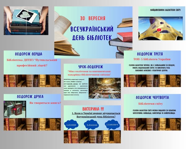 Сьогодні, до Всеукраїнського дня бібліотек🏫, здобувачі освіти ДПТНЗ ”ПУТИВЛЬСЬКИЙ ПРОФЕСІЙНИЙ ЛІЦЕЙ” здійснили неймовірну освітню мандрівку бібліотечними світами!📚🗺️Урок-подорож “Між століттями та континентами” став справжнім мостом у часі й просторі. Ми дослідили, як змінювалися бібліотеки від стародавніх клинописних табличок до сучасних цифрових ресурсів, зазирнули у книгосховища відомих світових бібліотек і переконалися, що бібліотека – це завжди простір знань, відкриттів та спілкування. Бібліотека – це не нудно, а мегацікаво та інноваційно!💥💥💥Дякуємо всім учасникам за активність, допитливість та любов до книги! Нехай ваша жага до знань ніколи не згасає.🎉🎉🎉Зі святом, шановні колеги та читачі!Запрошуємо всіх до нас у гості – книги вже чекають на нові пригоди!📚📚📚💐💐💐Вітаємо нашого бібліотекаря Nina Sorokina з її професійним святом! Бажаємо натхнення і щоб кожен день приходили учні-читачі за новими знаннями!Бібліотека – це компас у світі інформації!