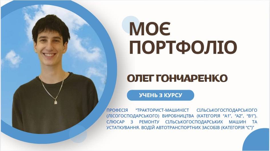 Фахівець високого класу – здобуває кваліфікацію тракториста-машиніста сільськогосподарського виробництва, слюсаря з ремонту та водія.Олег має відкрити категорії «А1», «А2», «В1», «С»та кваліфікацію слюсаря з ремонту сільськогосподарської техніки підкреслюючи, що може не тільки керувати складною технікою, а й полагодити її.