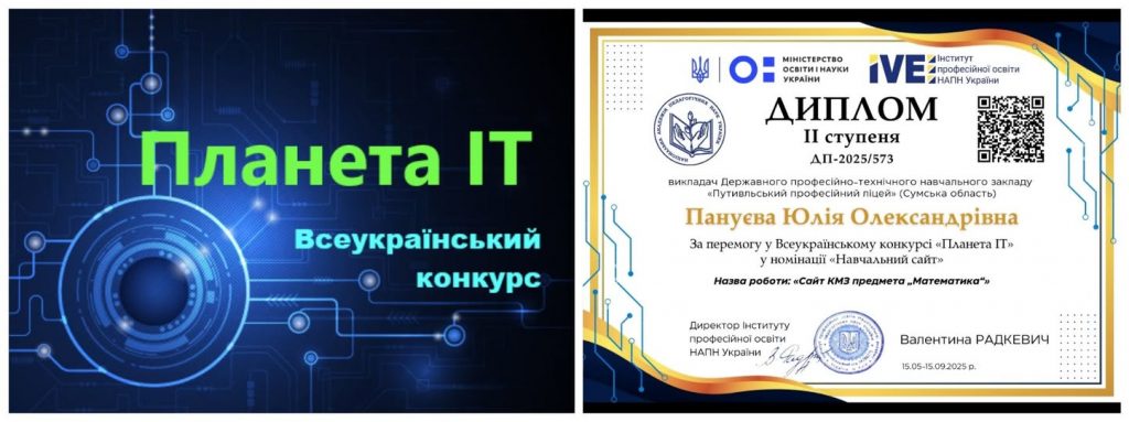 Колектив ДПТНЗ «Путивльський професійний ліцей» щиро вітає нашого методиста — Пануєву Юлію Олександрівну з видатним досягненням! За результатами Всеукраїнського конкурсу «Планета ІТ», Юлія Олександрівна здобула диплом ІІ ступеня у номінації «Навчальний сайт» ![]()