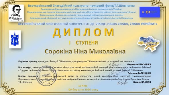 ✨ Конкурс організовано Всеукраїнським благодійним культурно-науковим фондом Т. Г. Шевченка за підтримки освітніх та культурних установ України і присвячено популяризації творчості Кобзаря та розвитку краєзнавчих досліджень. Цей результат — свідчення високого професіоналізму, творчого підходу до роботи та щирої любові до українського слова і культури.